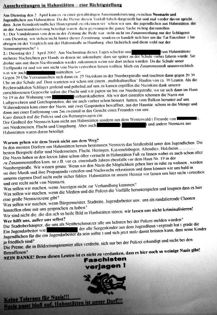 Die Presse schrieb stellte es als unpolitische Randale dar. Im Dorf kippte die Stimmung gegen uns. Wir machten einen Flugzettel, den ich noch habe, verteilten ihn – die Stimmung drehte sich wieder. Ich habe auch noch ein paar von den alten Zeitungsartikeln. Die Nazis hielten sich danach zurück. Hätten wir nicht gegengehalten, hätten sie das Dorf übernommen. Ganz plump: Zwei ziehen hin, rufen Verstärkung aus dem Westerwald, belästigen und bedrohen Leute. Autos mit WW-Kennzeichen fuhren vor.