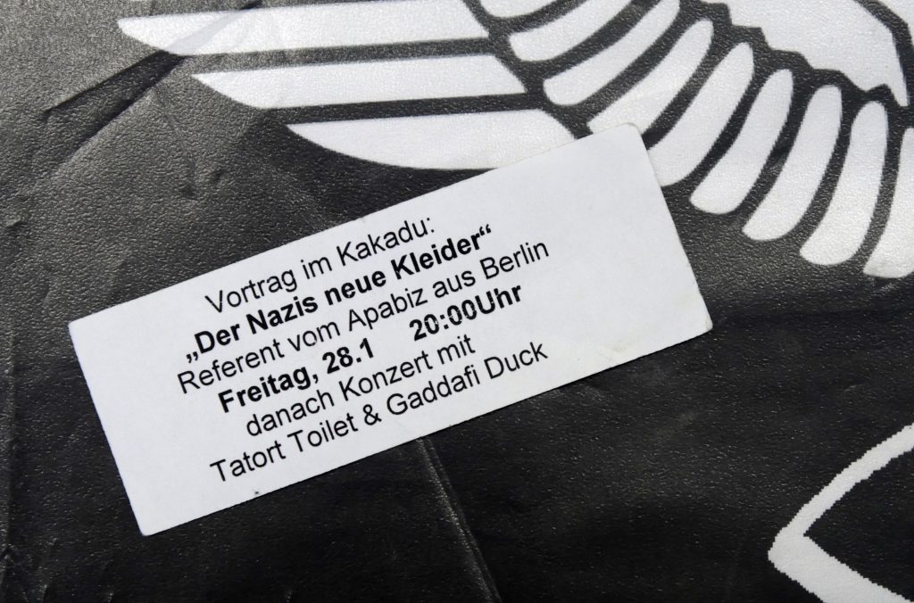 Zwei Sachen würde ich gerne erzählen. Viele Bands probten damals im Kulturzentrum. Eine Metalband hatte ein komisches selbstgebasteltes Logo – ein Original-NSDAP-Adler, aber statt Hakenkreuz der Bandname. Das Logo hing an der Proberaumtür. Das gab eine monatelange Vereinsdiskussion. Wir pushten das Thema und sagten: Wir müssen Aufklärungsarbeit machen, eine Veranstaltung organisieren. Wir sagten nicht „Das sind Nazis“, aber „Man darf sich nicht solcher Symbolik bedienen“. Wir organisierten eine Veranstaltung, luden jemanden vom apabiz Berlin ein, der Styles und Codes erklärte. Wahnsinnig gut besucht. Das war Auseinandersetzung im eigenen Raum – nicht nur Nazis von außen, sondern auch in den eigenen Bands Leute, die komische Logos basteln, ohne zu kapieren, was da alles dranhängt.